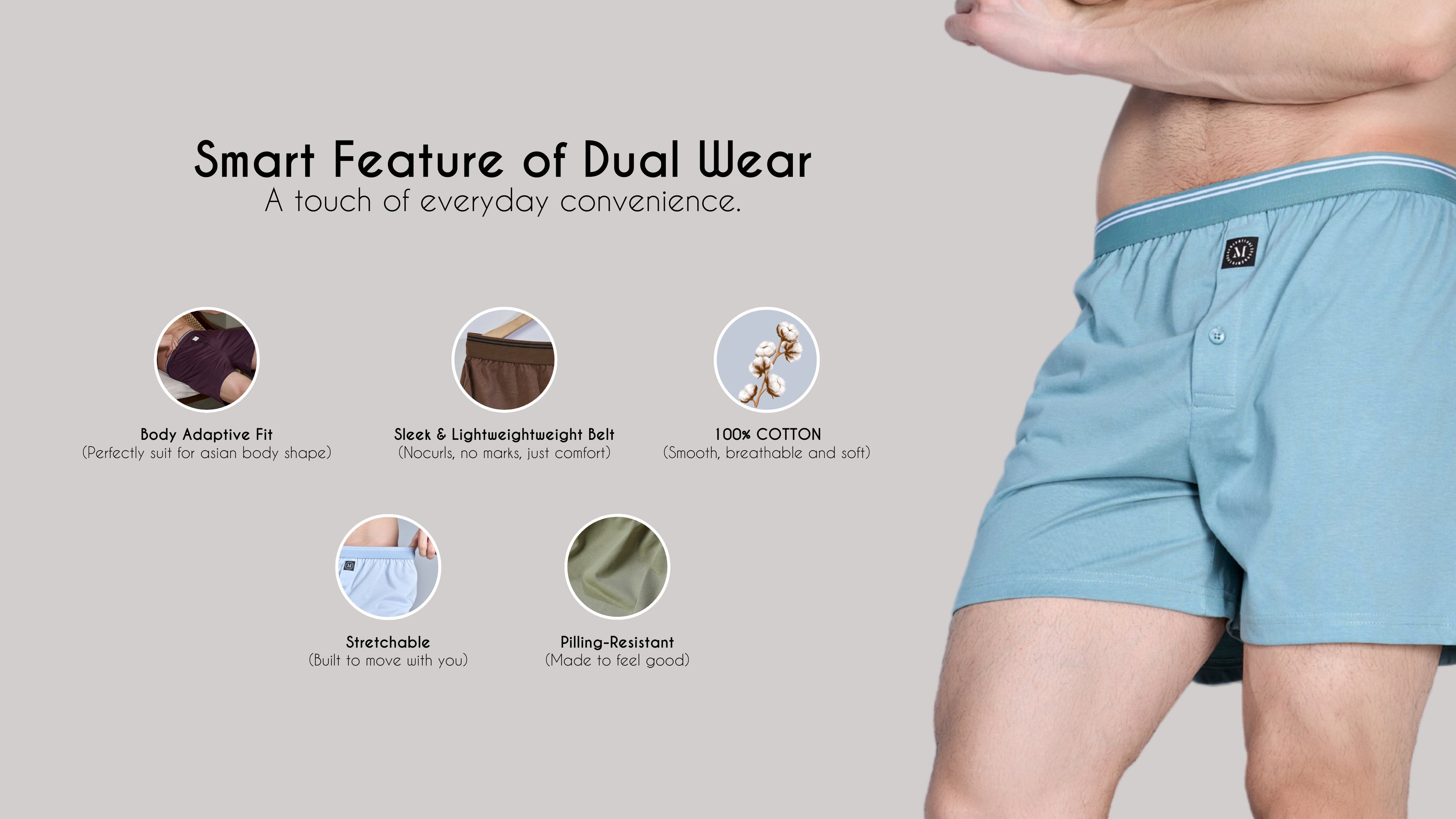 Introducing the new Dual Wear Boxer! Made from 100% premium cotton, these boxers are soft, breathable, and offer just the right amount of stretch to move with you throughout the day. The non-slip waistband ensures they stay perfectly in place, no matter what you're up to, while the easy-open button fly adds a touch of everyday convenience. Available in a range of eye-catching colours, Dual Wear Boxers are designed to feel good and look even better.