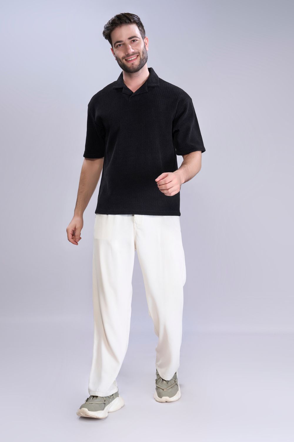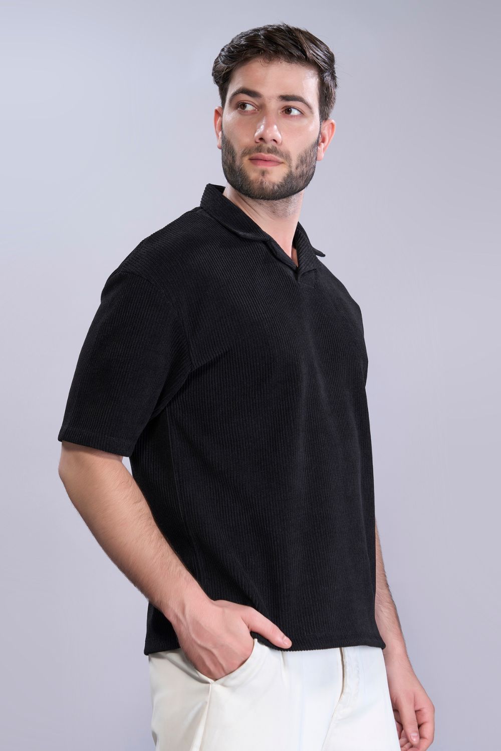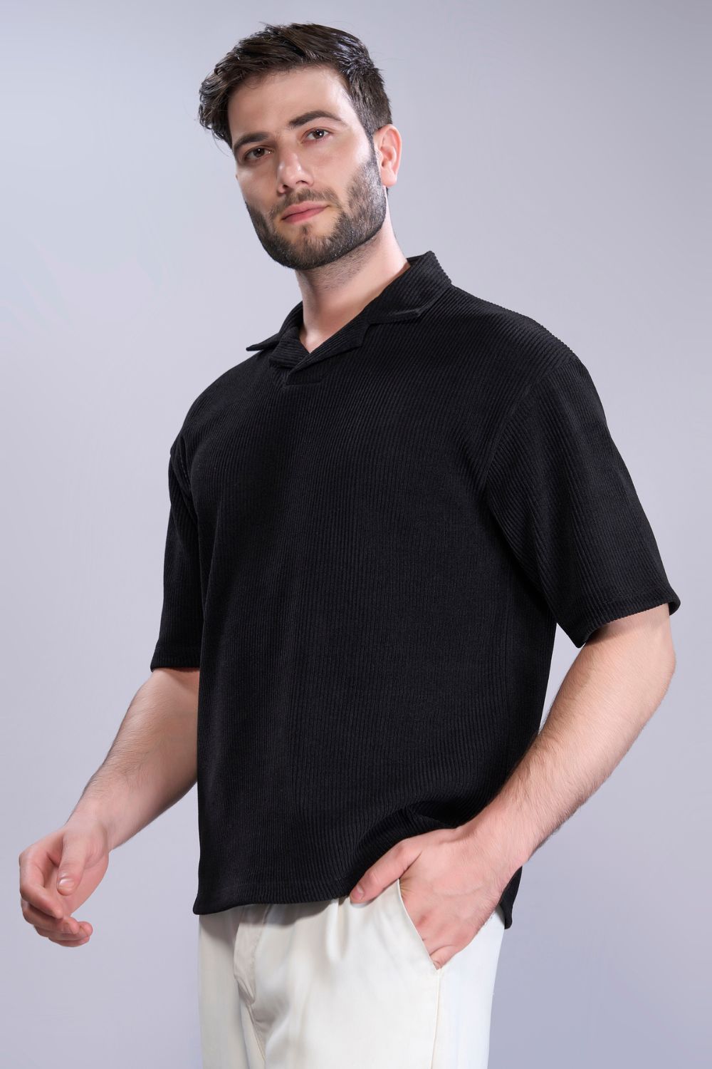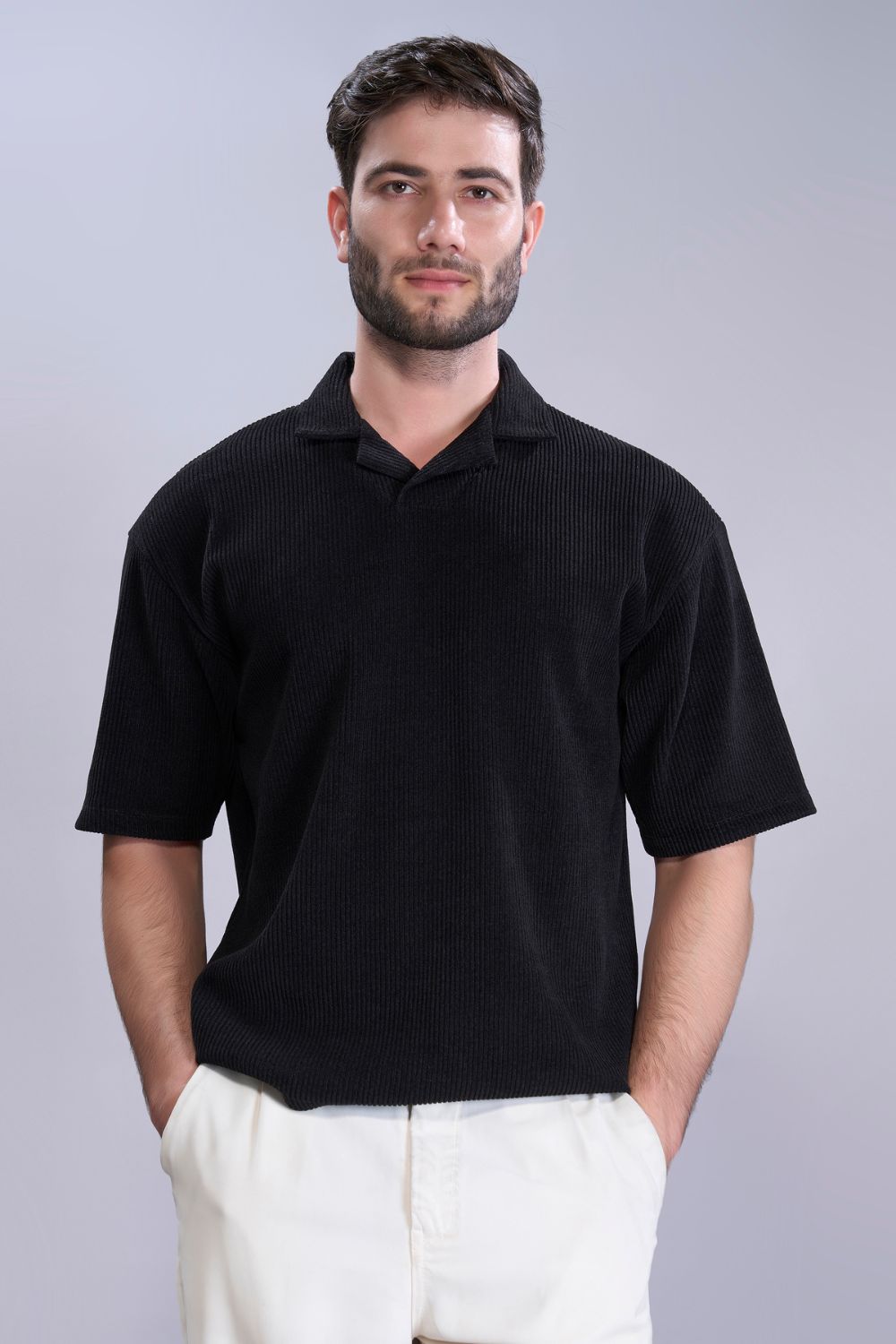 Introducing our oversized men’s polo t-shirt, crafted from soft and durable Boldbloc knit fabric. A button-free collar and relaxed fit for maximum comfort for casual outings or lounging at home. This polo features a muted color palette and subtle details, blending classic style with modern comfort. Elevate your wardrobe with this timeless piece.