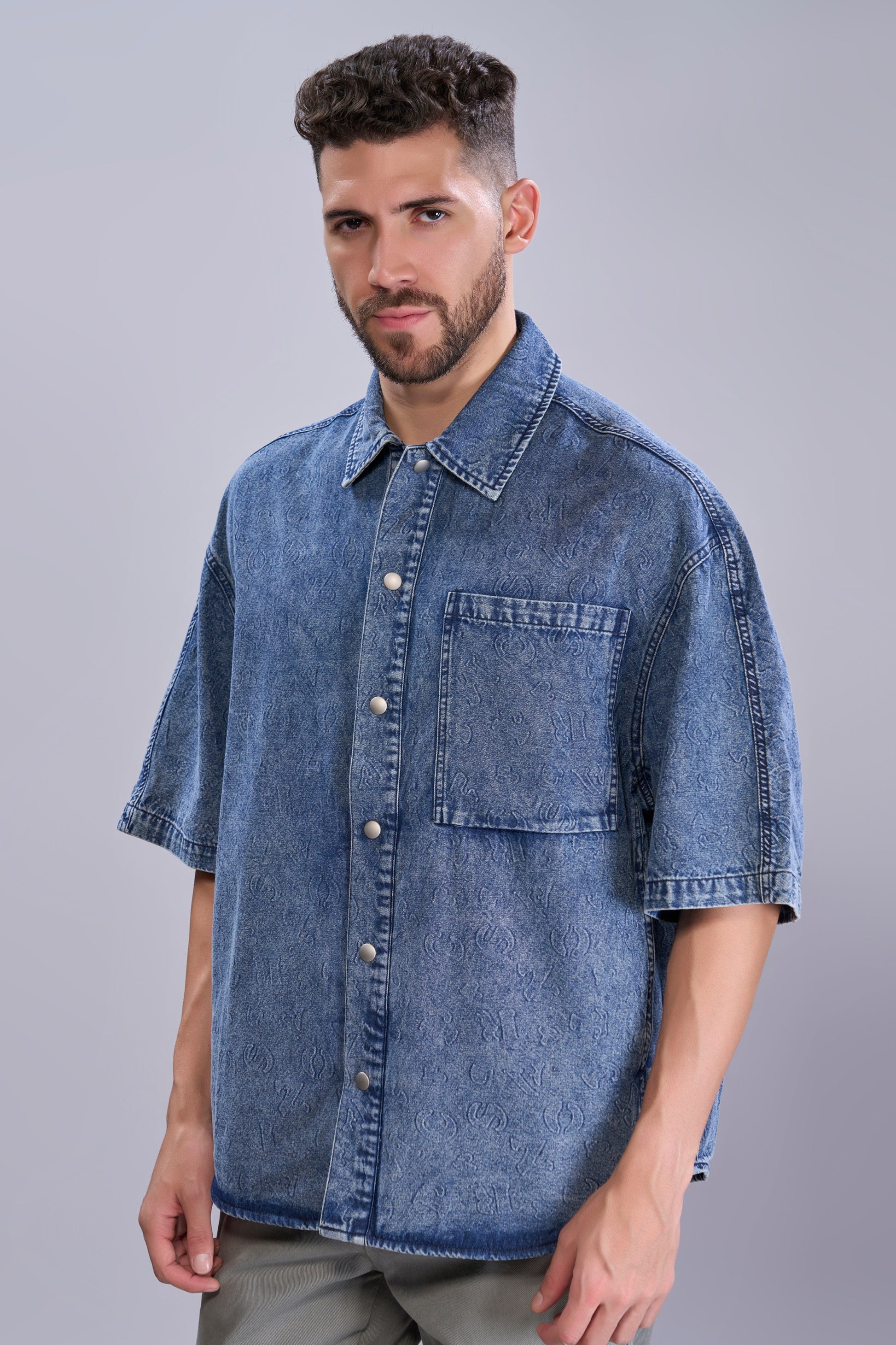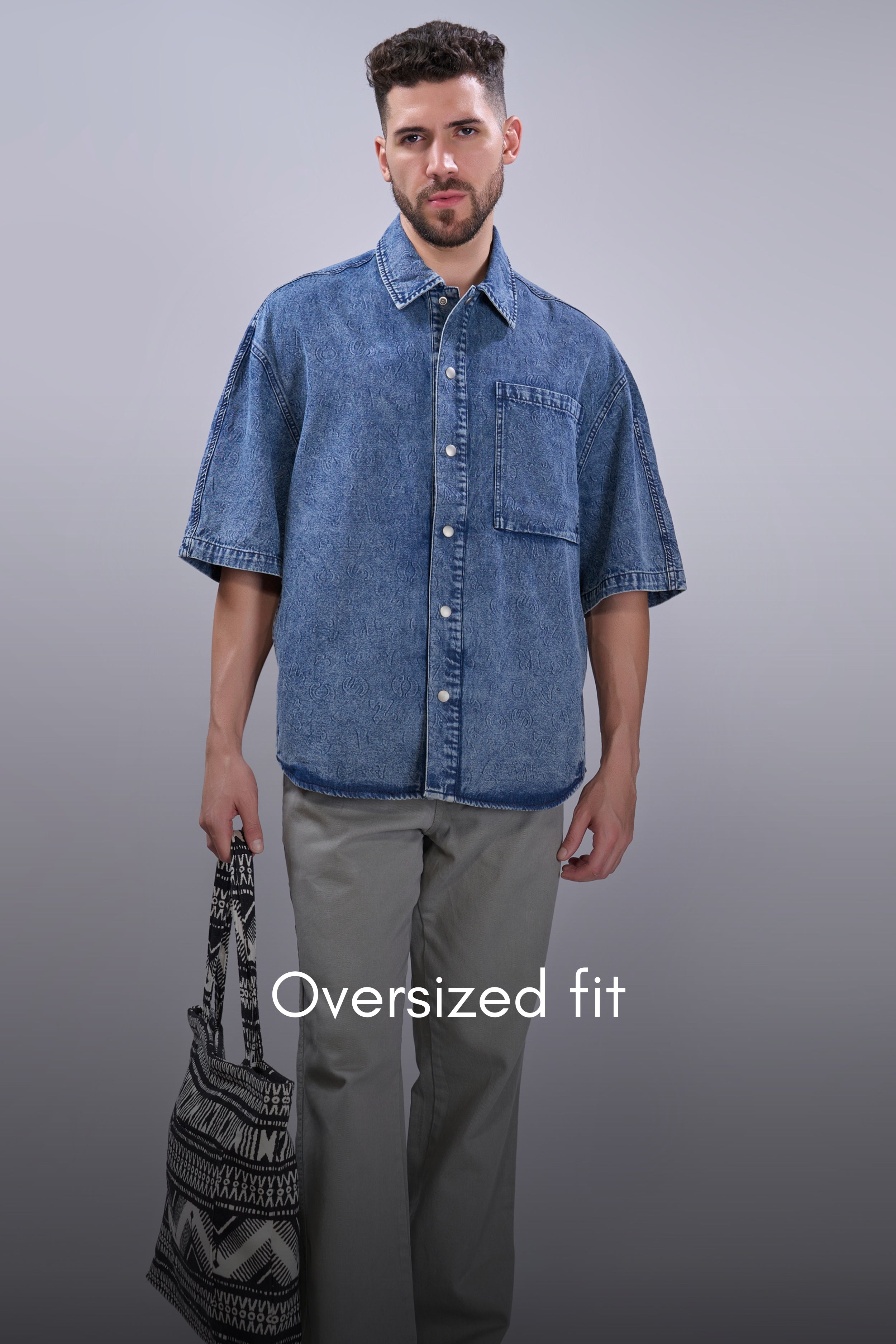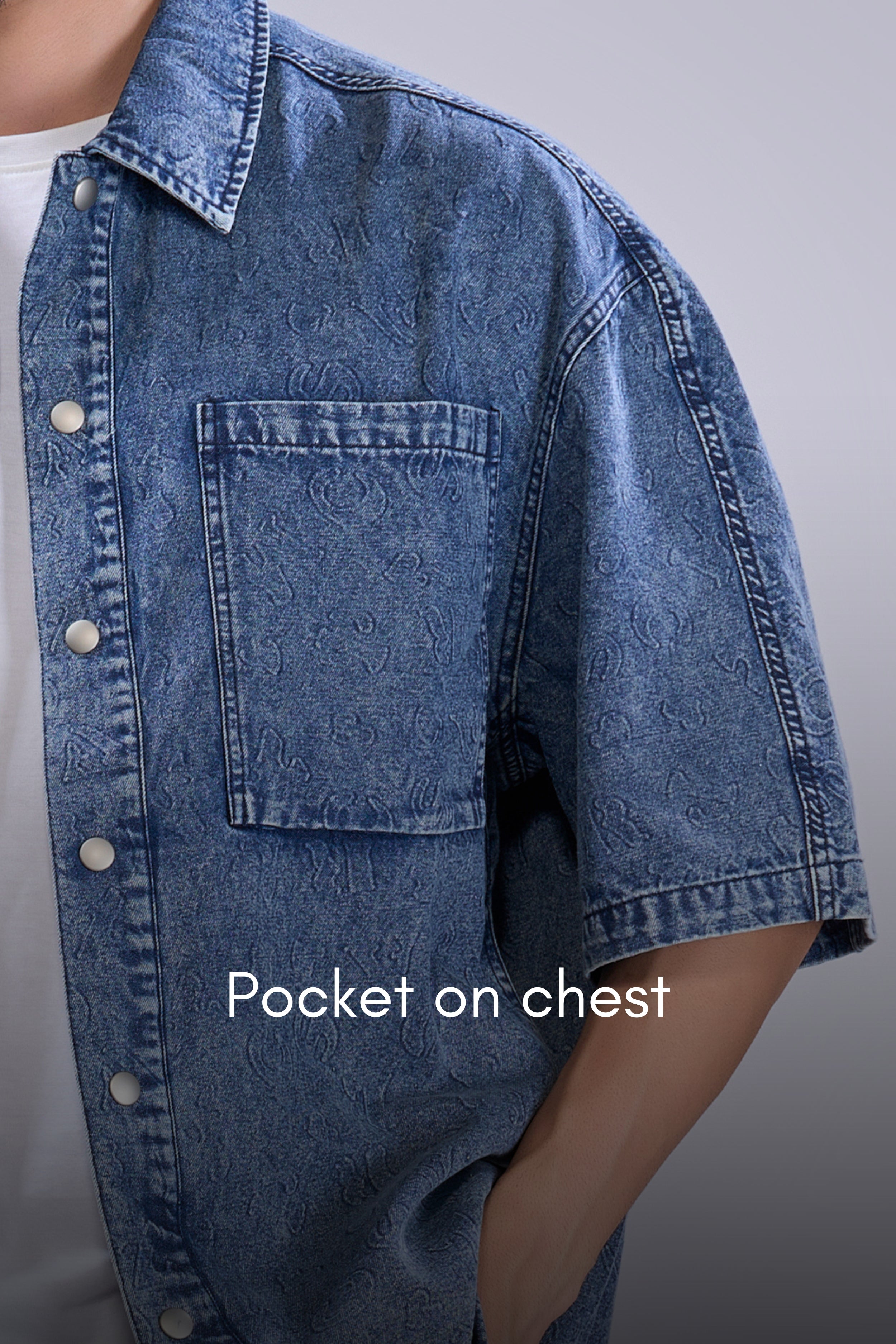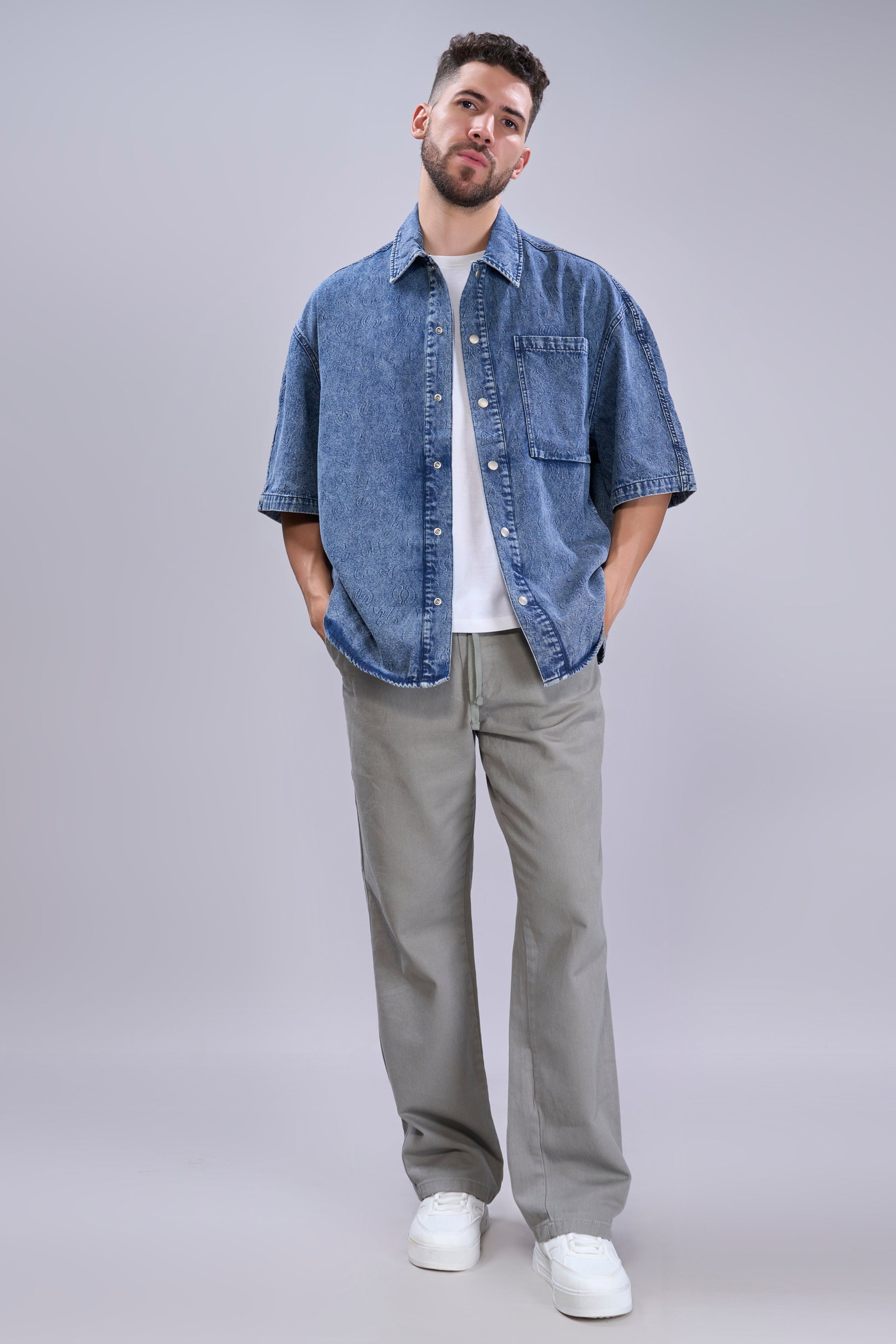 Introducing this classic medium blue denim shirt, designed for effortless street-style appeal. Featuring a slightly washed-out finish and crafted from sturdy denim with a coarse, textured weave, it brings rugged charm to your wardrobe. The traditional point collar, white snap buttons, and oversized chest pocket add functional style. With its relaxed, oversized fit and loose short sleeves, this shirt is perfect for a laid-back, modern look.