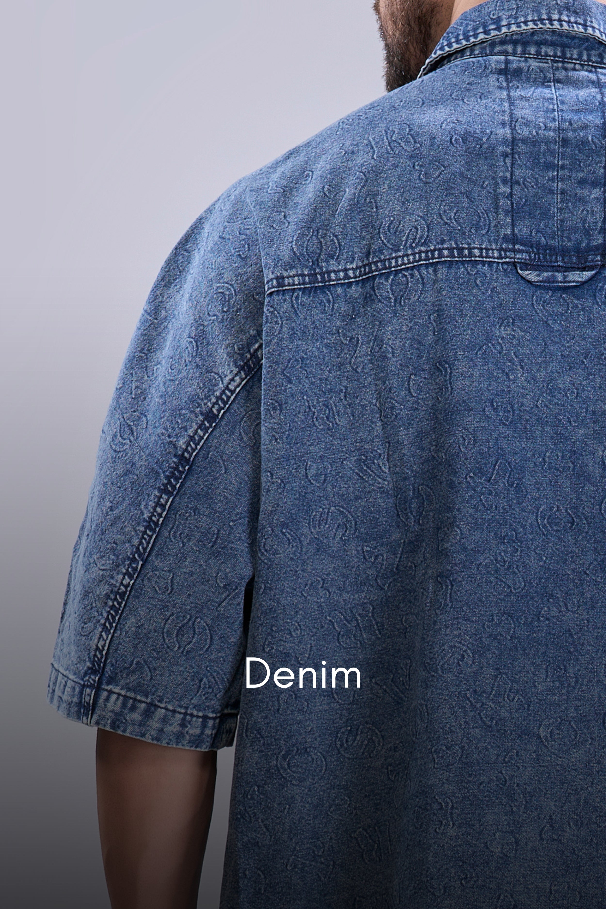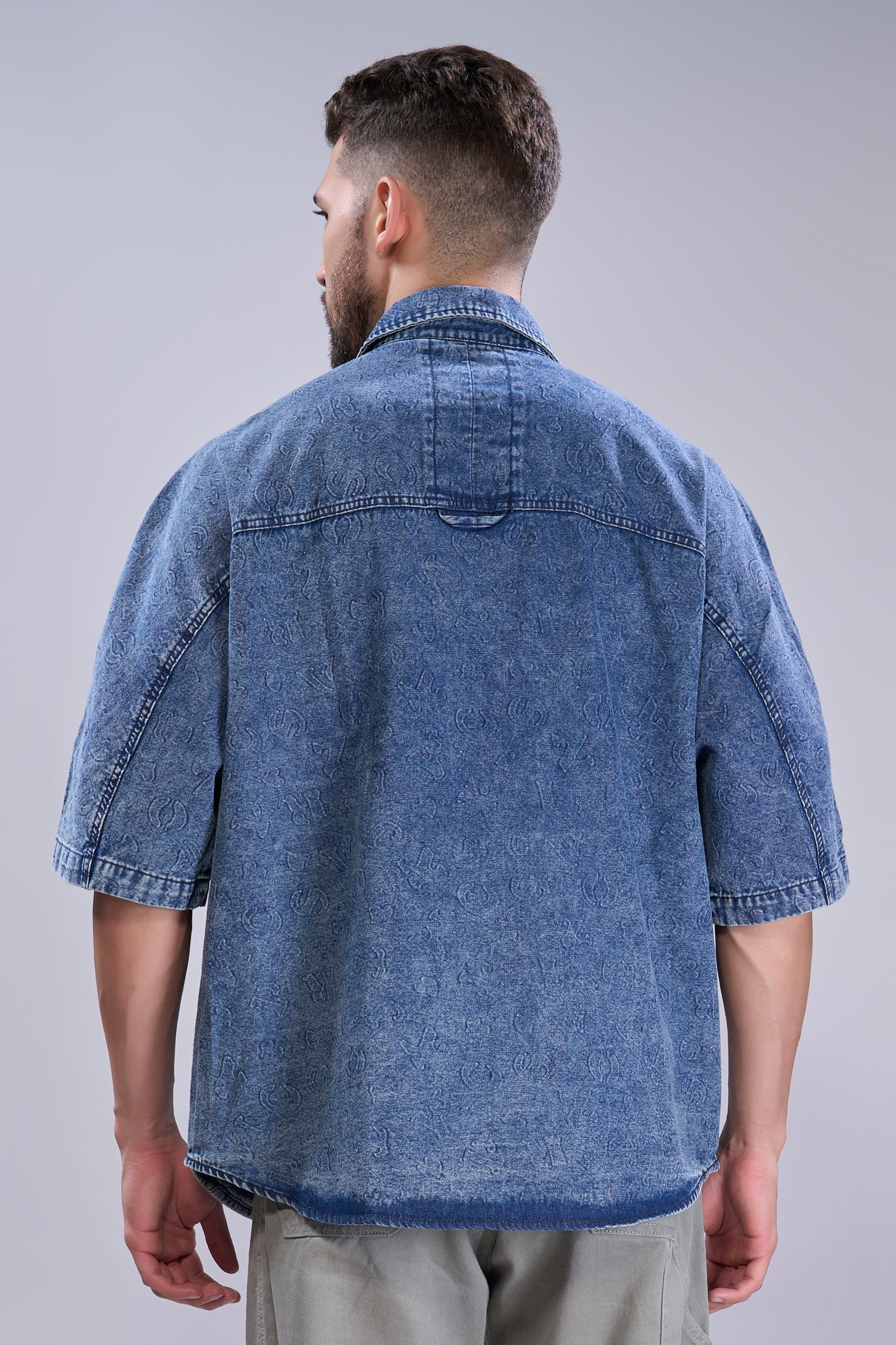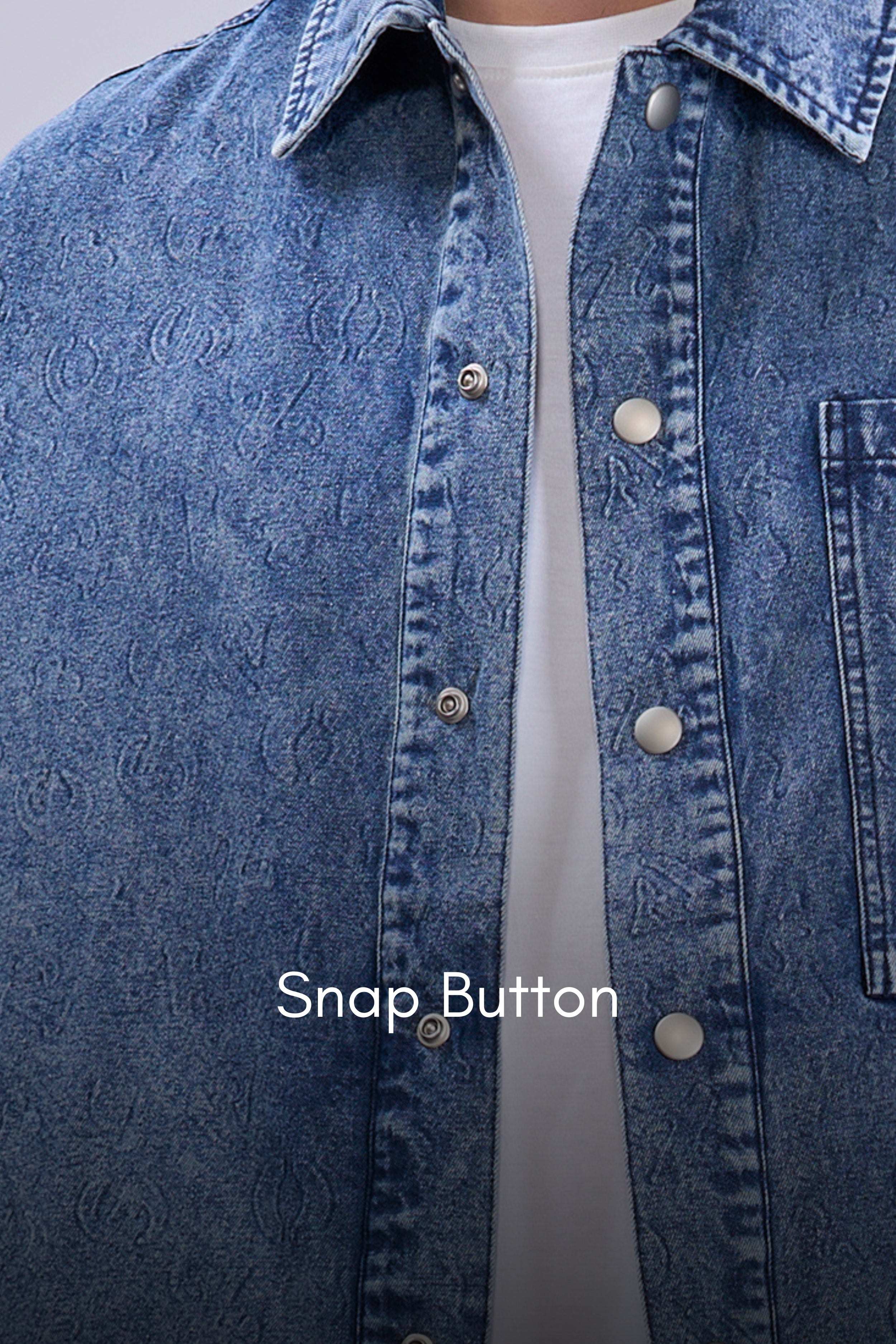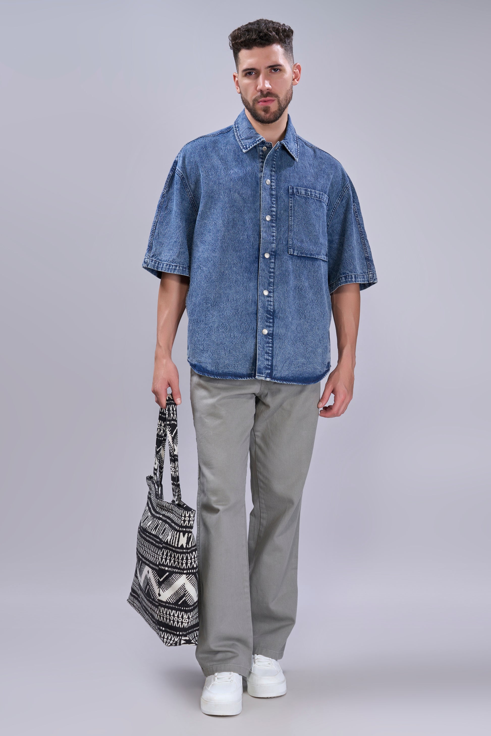 Introducing this classic medium blue denim shirt, designed for effortless street-style appeal. Featuring a slightly washed-out finish and crafted from sturdy denim with a coarse, textured weave, it brings rugged charm to your wardrobe. The traditional point collar, white snap buttons, and oversized chest pocket add functional style. With its relaxed, oversized fit and loose short sleeves, this shirt is perfect for a laid-back, modern look.