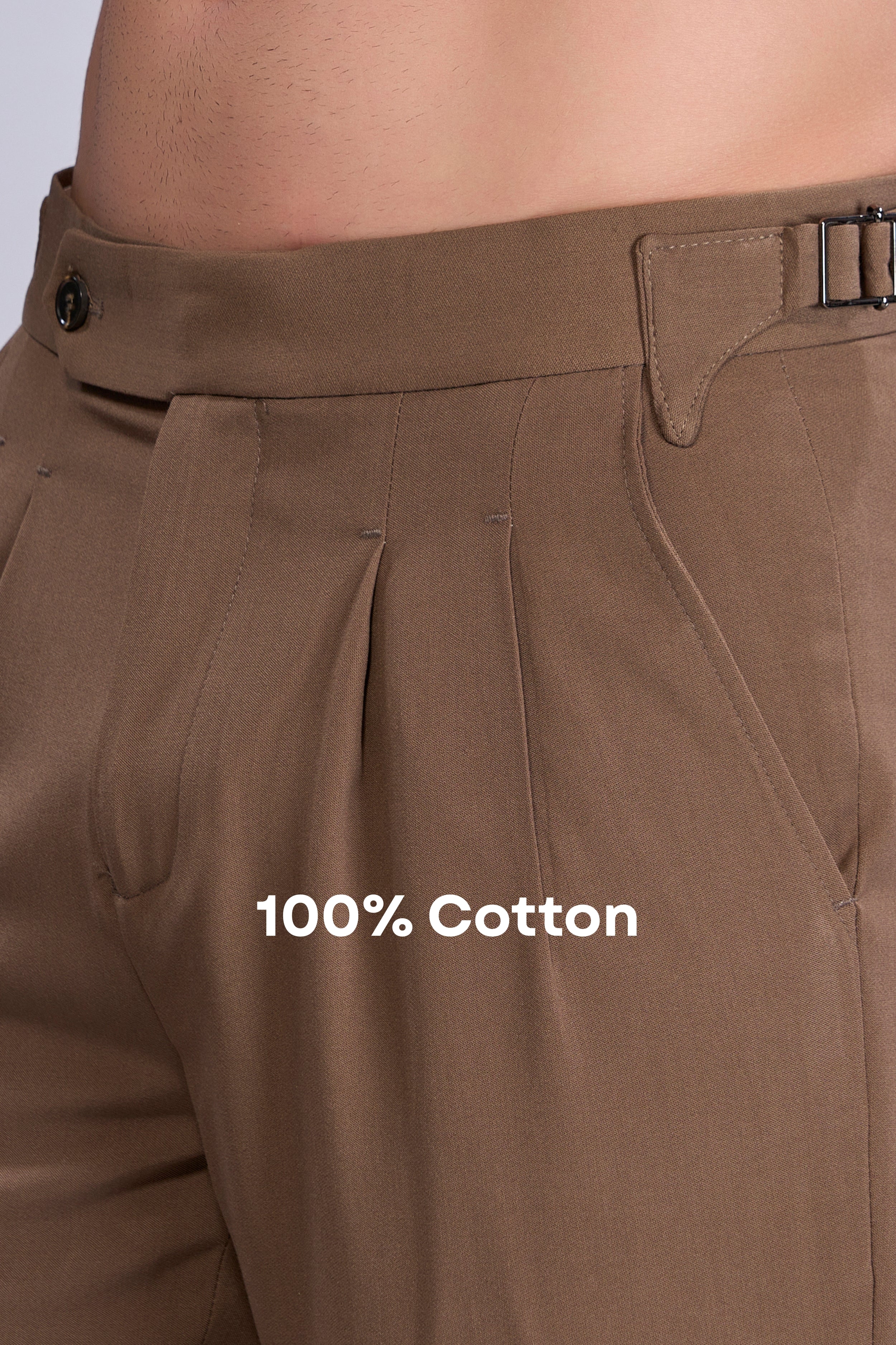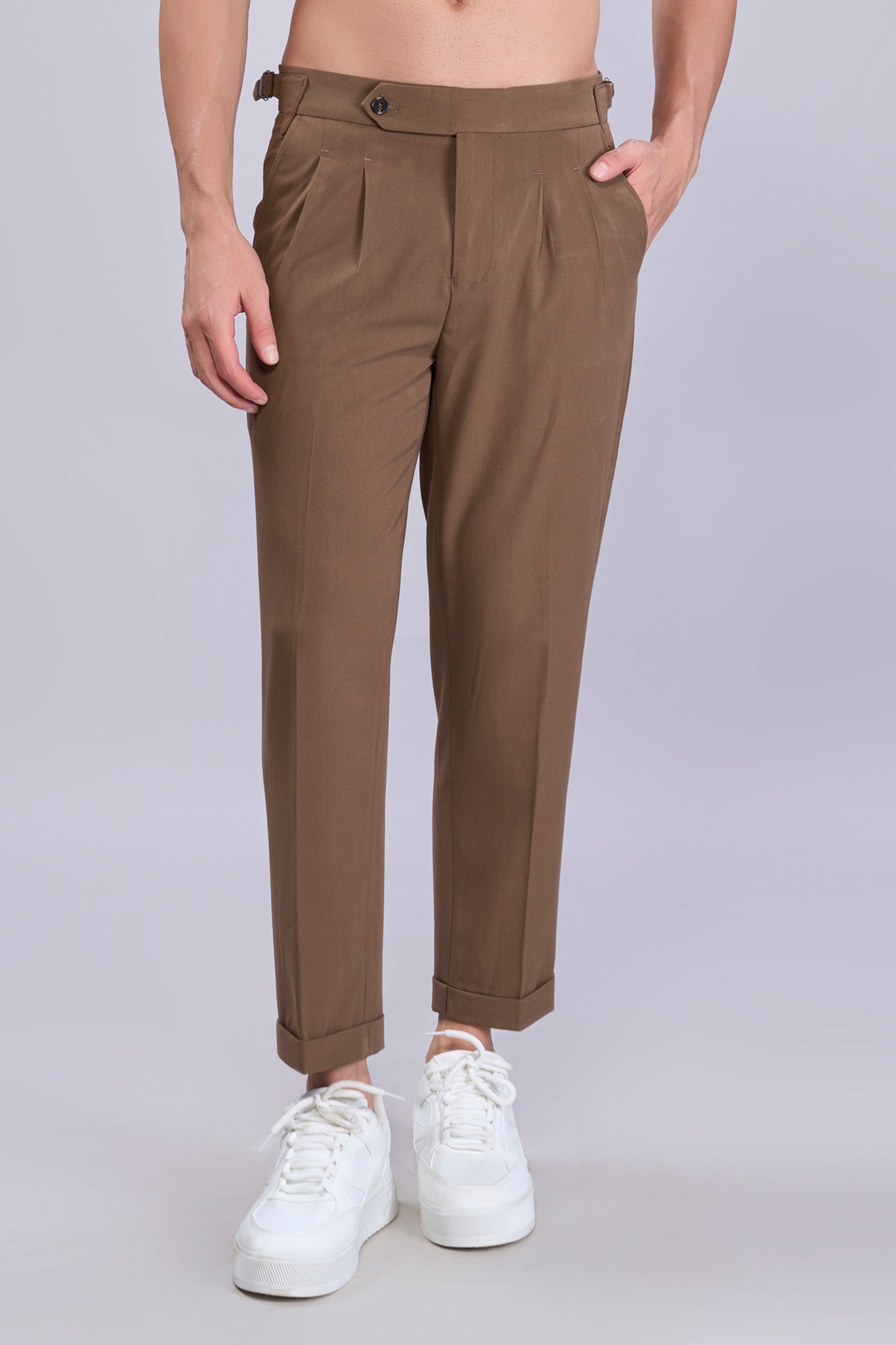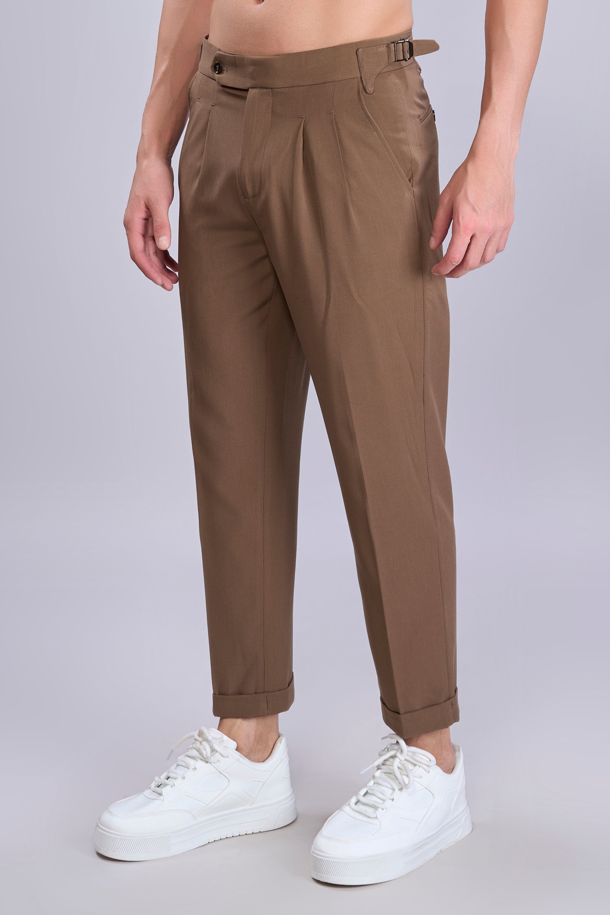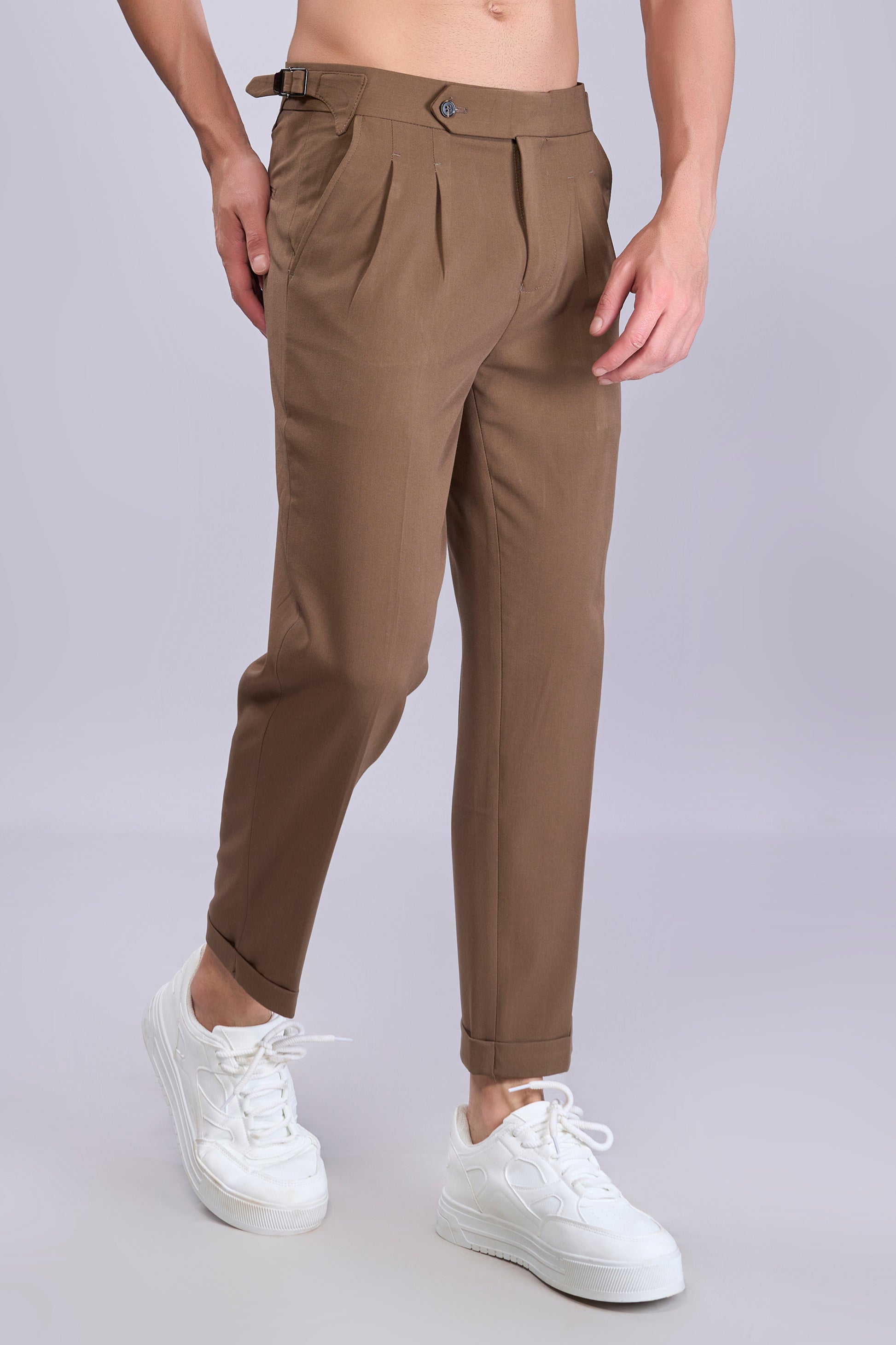 Tailored from breathable 100% cotton twill, these pleated trousers feature a tapered fit with cuffed hems and a clean extended waistband. Side adjusters with metal buckles offer a custom fit—no belt needed. Finished with angled front pockets, buttoned welt back pockets, and soft rear paneling for added comfort and structure. Perfect for smart-casual styling and everyday sophistication.