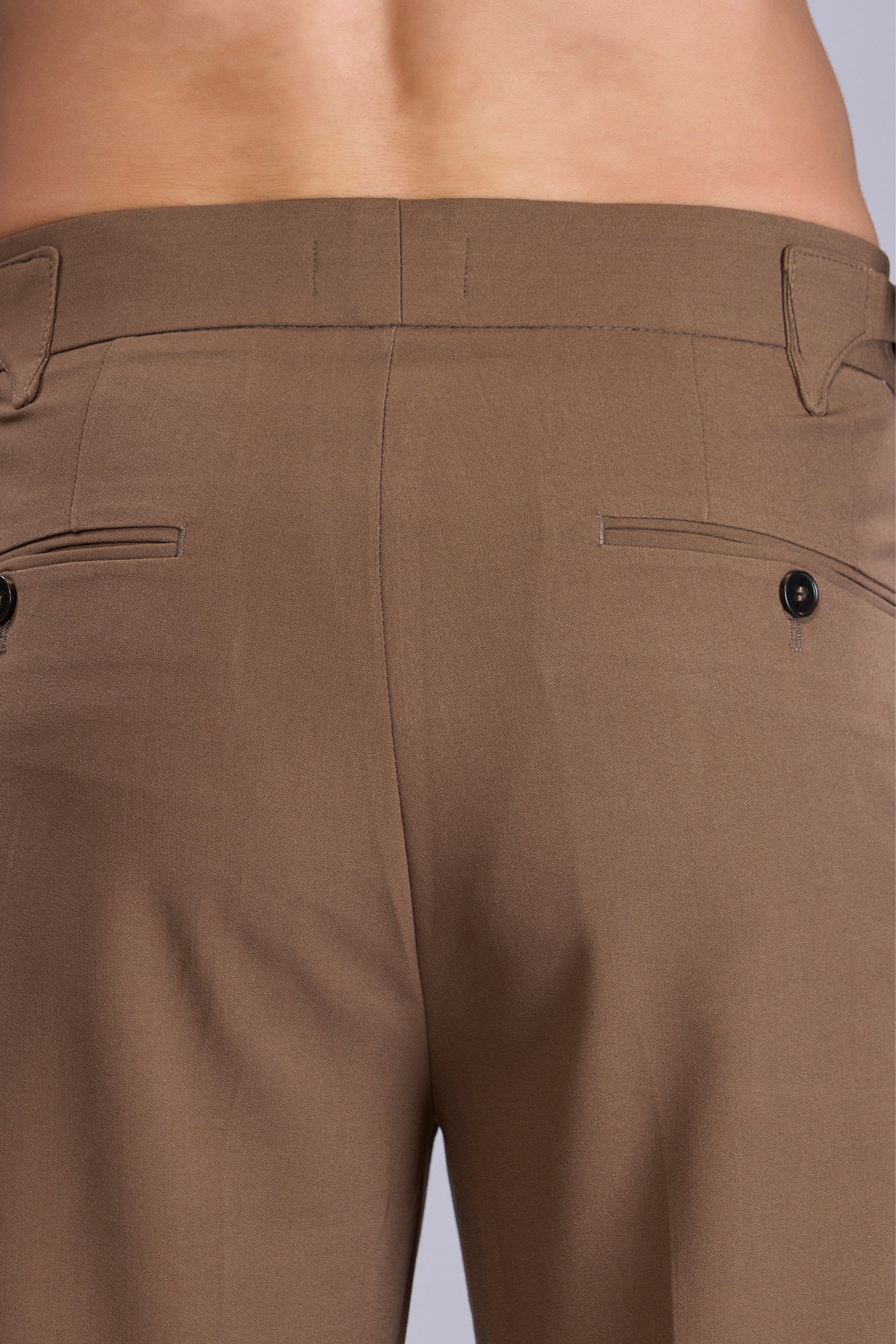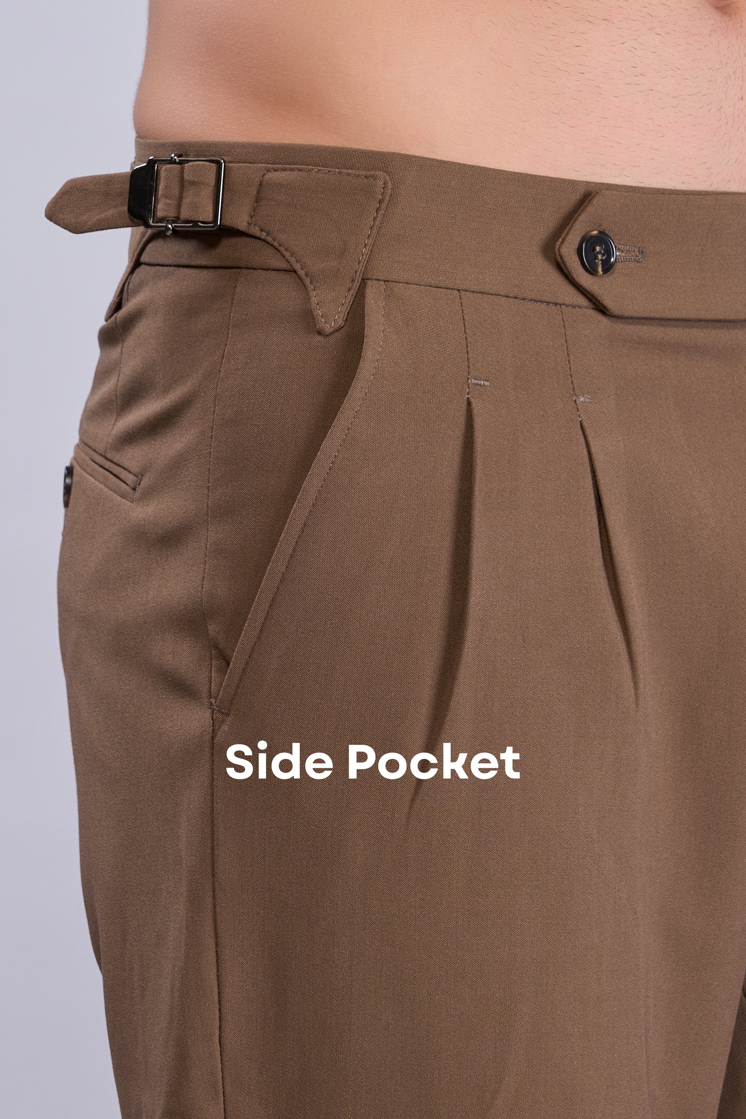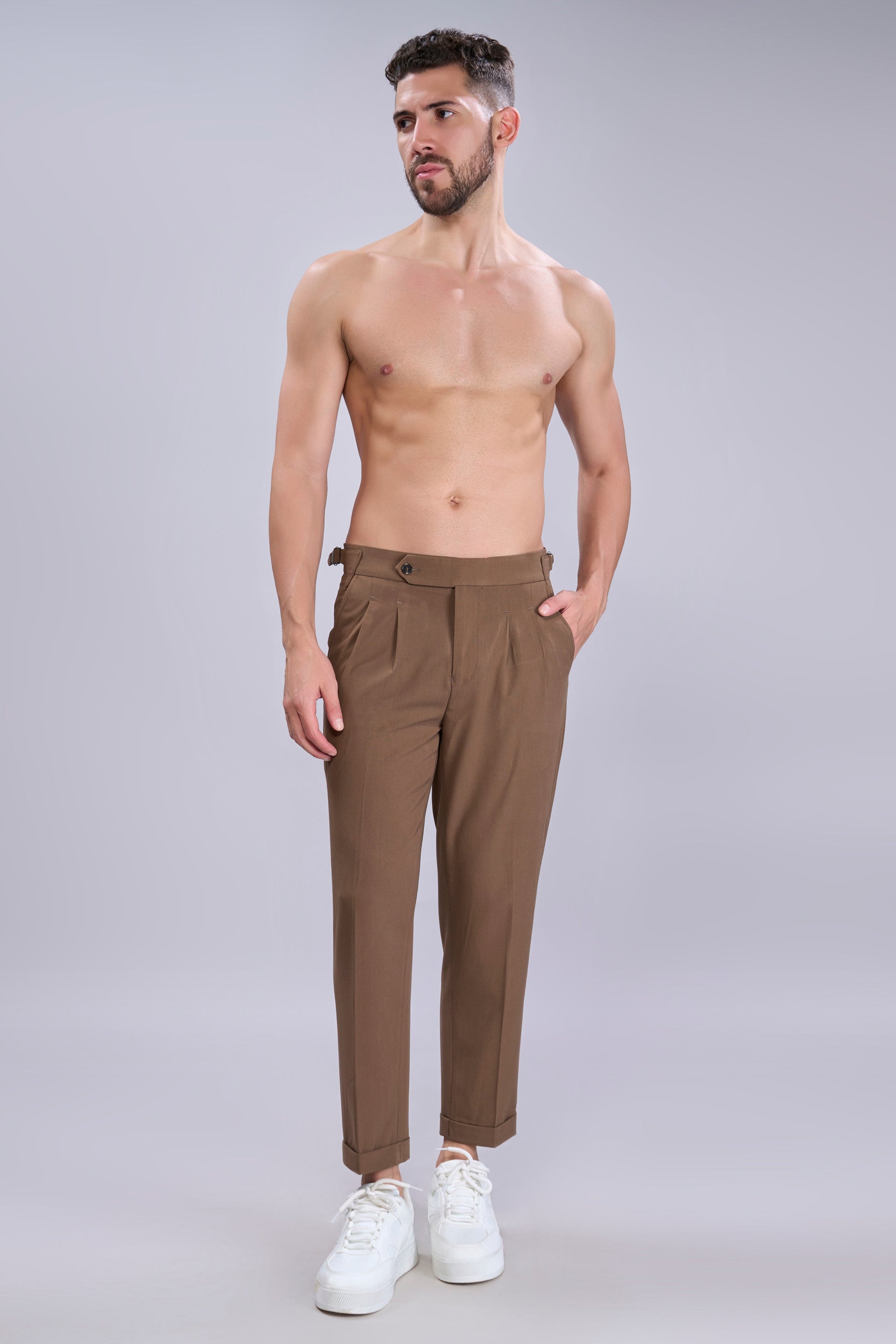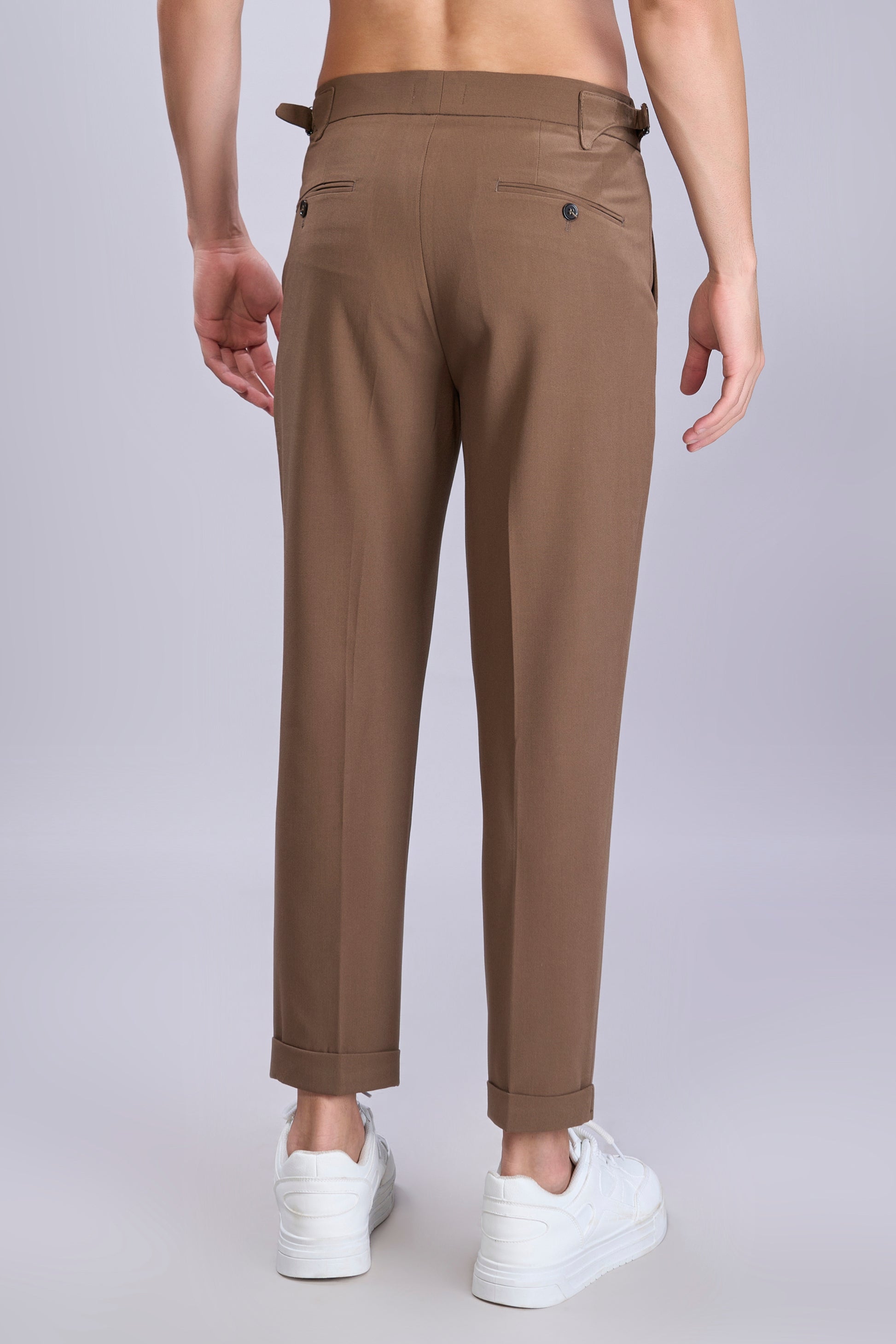 Tailored from breathable 100% cotton twill, these pleated trousers feature a tapered fit with cuffed hems and a clean extended waistband. Side adjusters with metal buckles offer a custom fit—no belt needed. Finished with angled front pockets, buttoned welt back pockets, and soft rear paneling for added comfort and structure. Perfect for smart-casual styling and everyday sophistication.