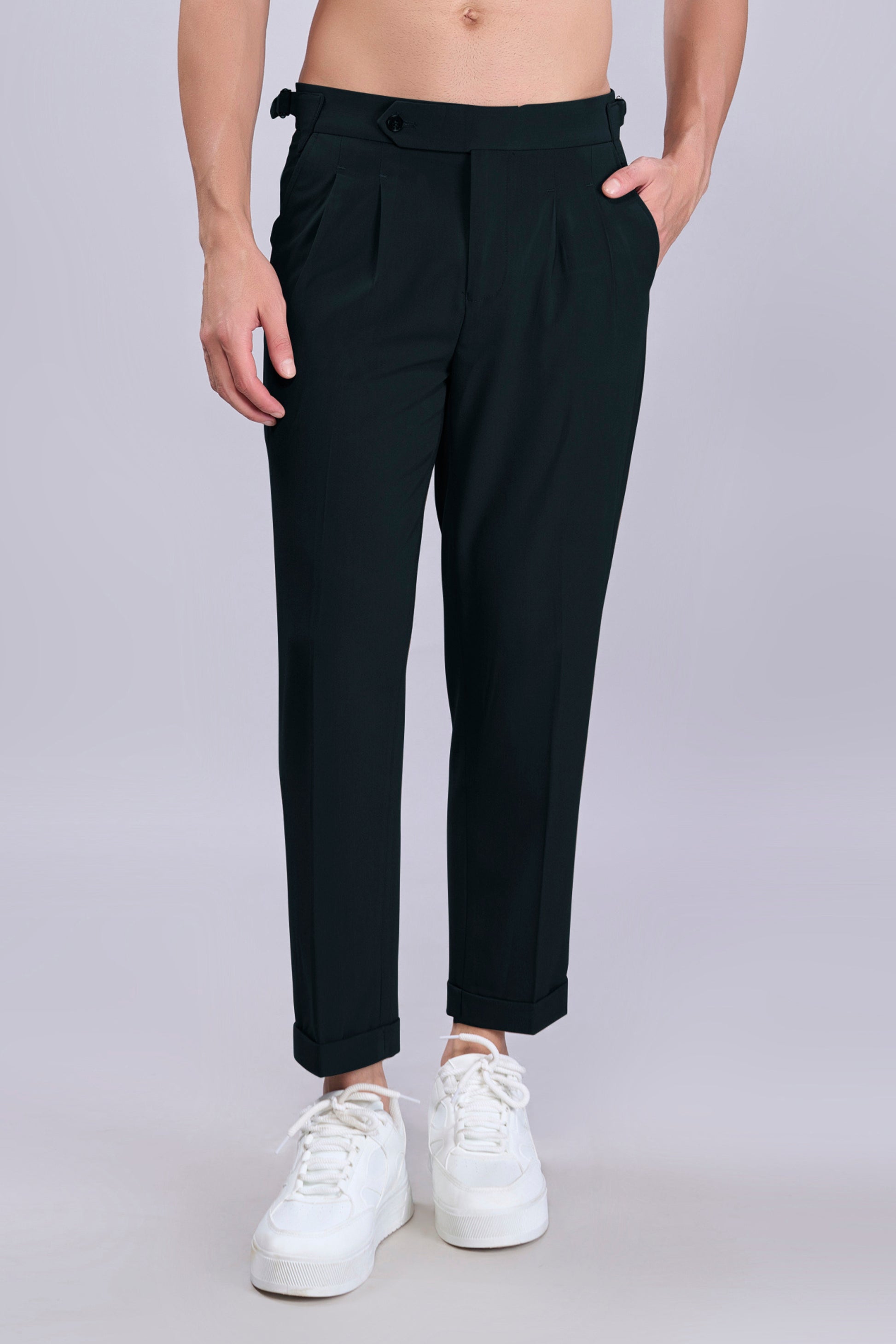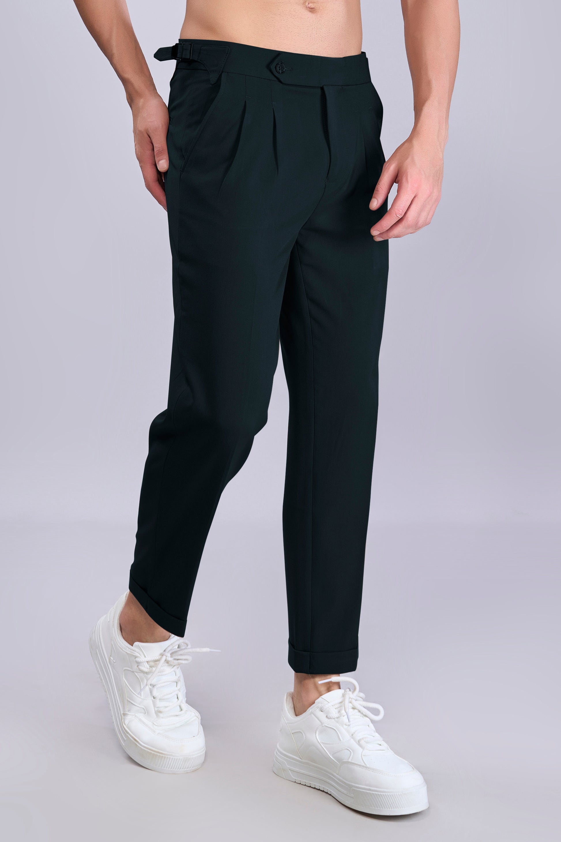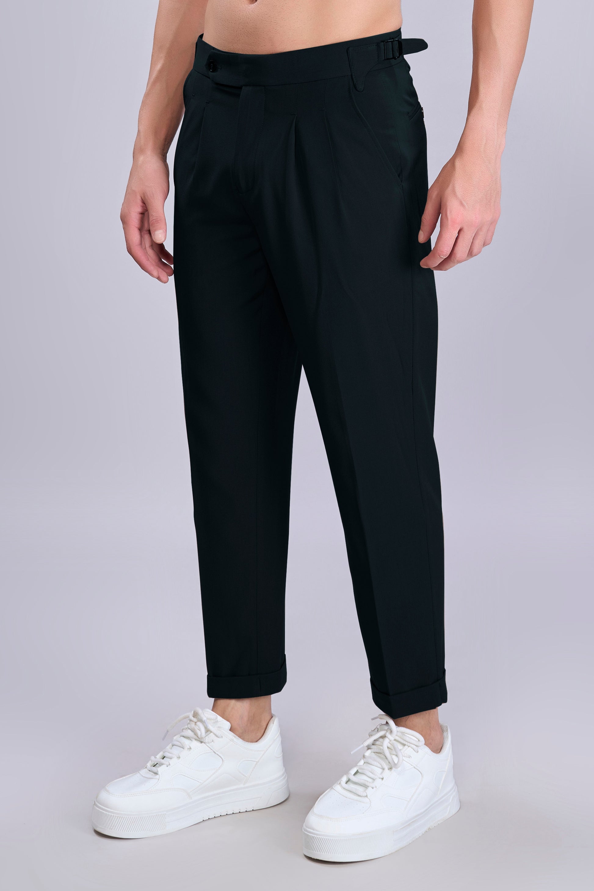 Tailored from breathable 100% cotton twill, these pleated trousers feature a tapered fit with cuffed hems and a clean extended waistband. Side adjusters with metal buckles offer a custom fit—no belt needed. Finished with angled front pockets, buttoned welt back pockets, and soft rear paneling for added comfort and structure. Perfect for smart-casual styling and everyday sophistication.