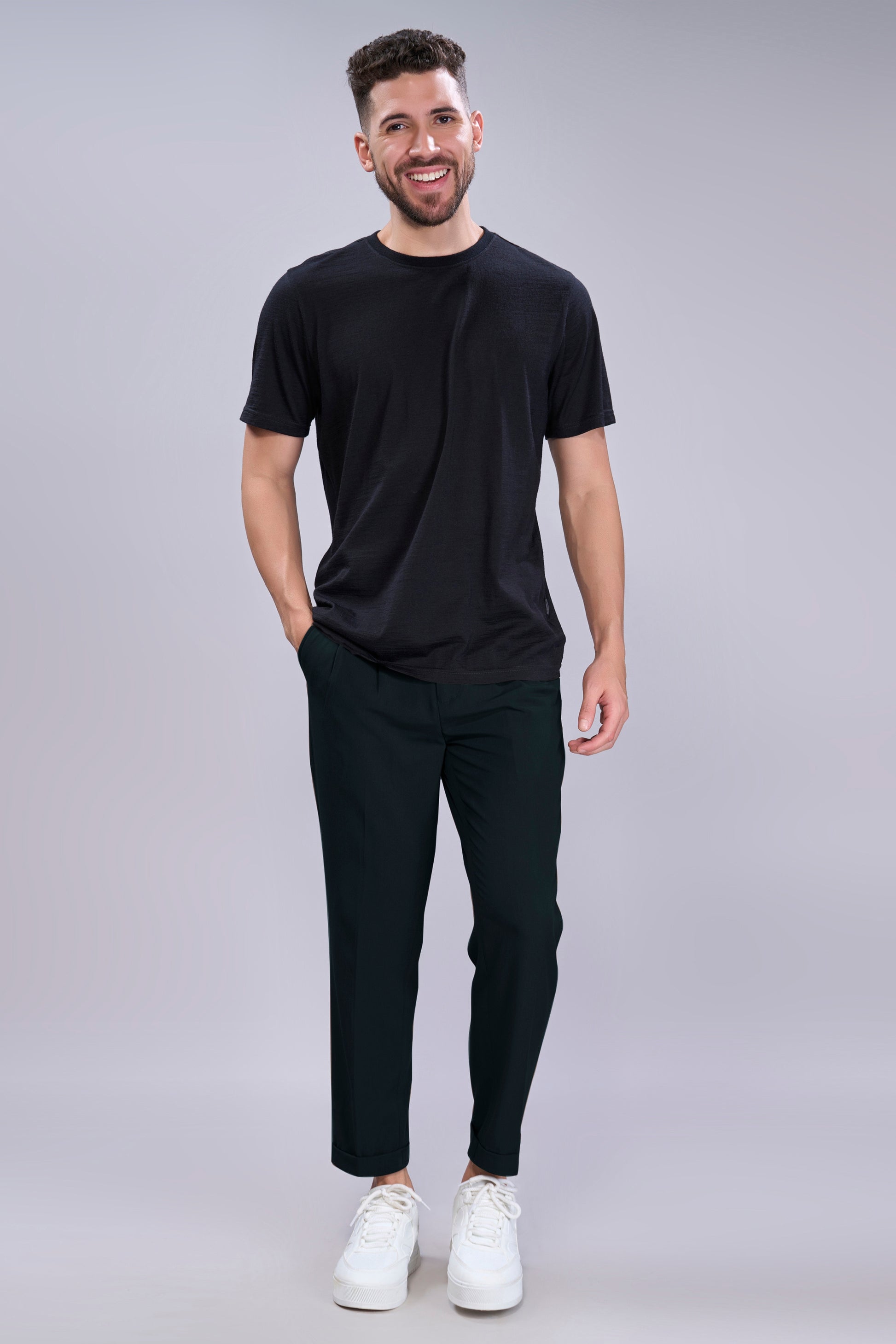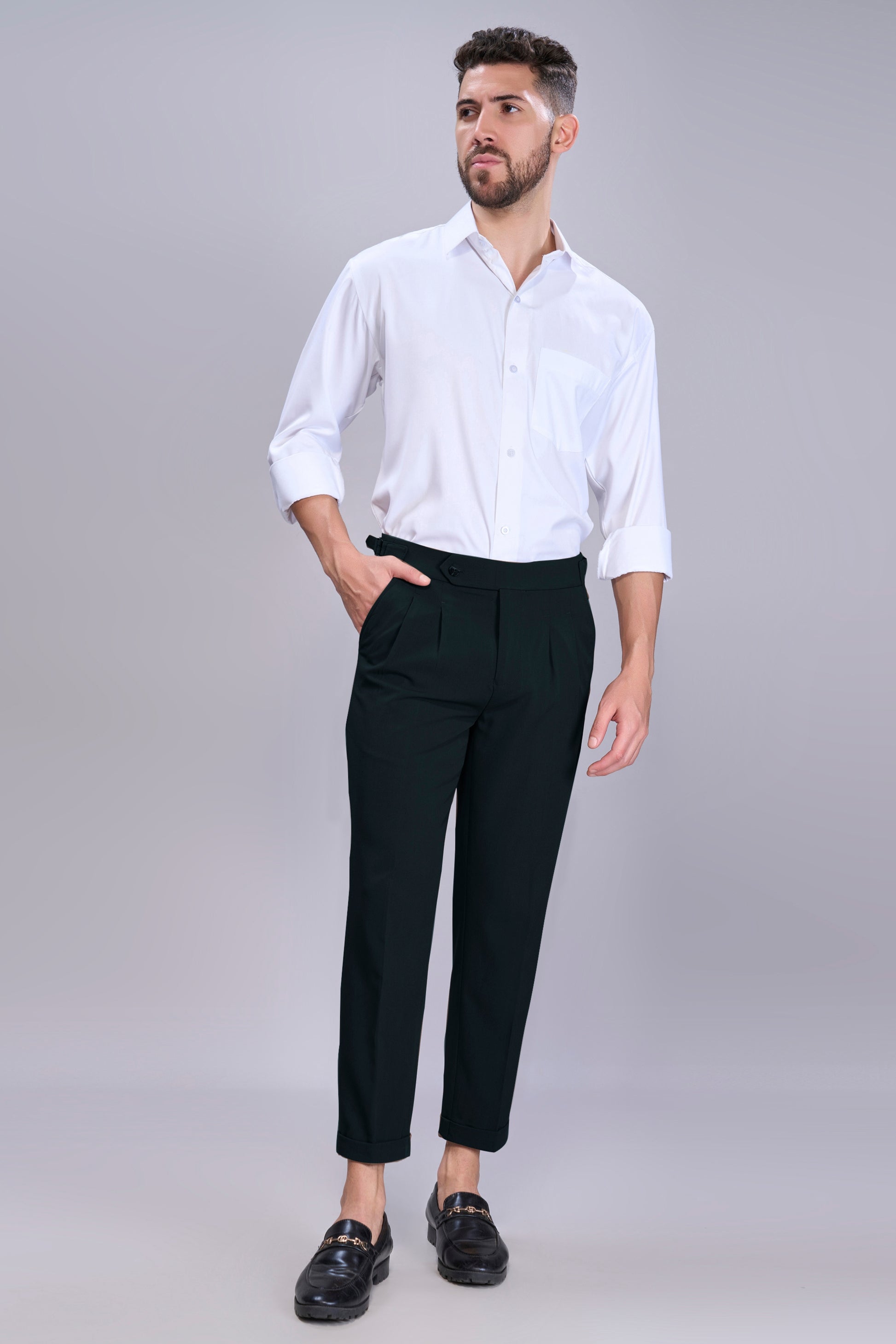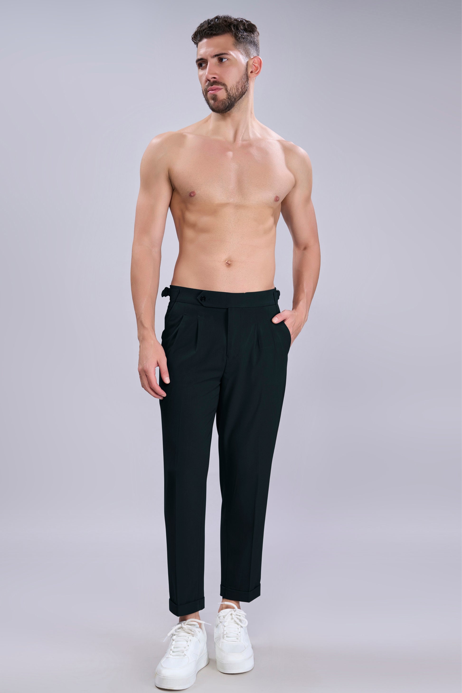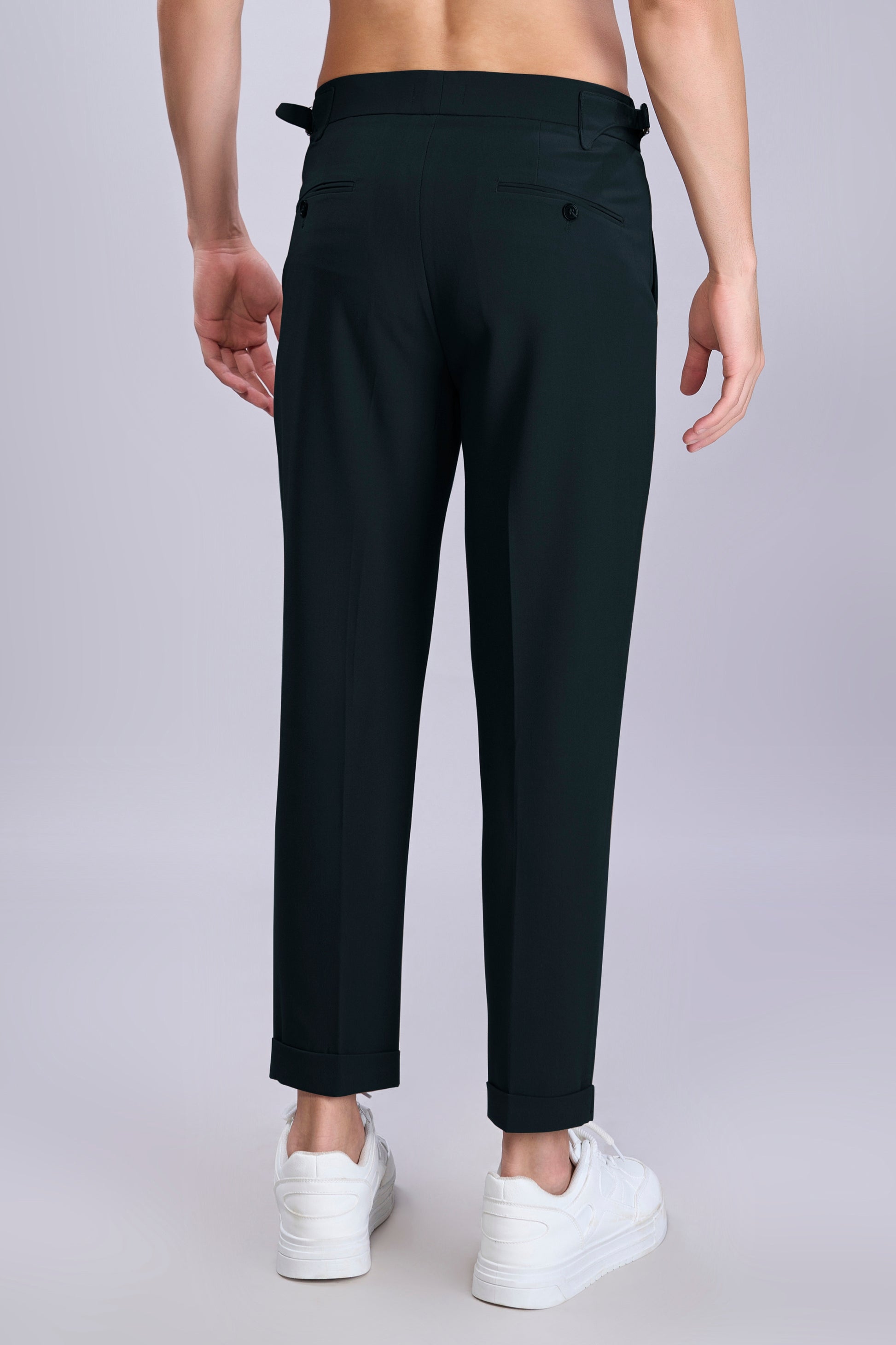 Tailored from breathable 100% cotton twill, these pleated trousers feature a tapered fit with cuffed hems and a clean extended waistband. Side adjusters with metal buckles offer a custom fit—no belt needed. Finished with angled front pockets, buttoned welt back pockets, and soft rear paneling for added comfort and structure. Perfect for smart-casual styling and everyday sophistication.
