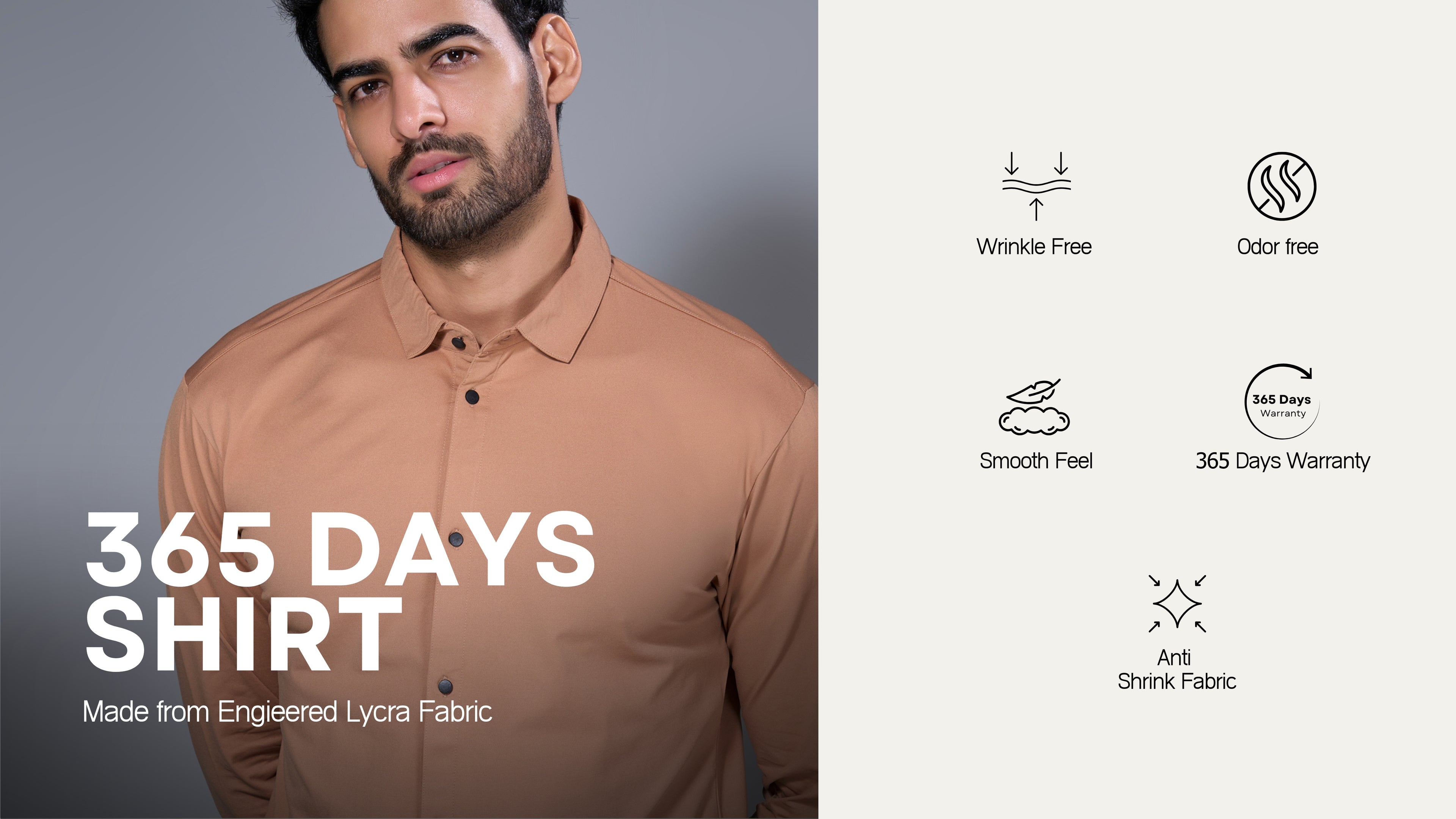 Experience comfort that lasts all year with our 365 Days Shirt, crafted from premium Engineered Lycra fabric. Designed for everyday wear, this shirt combines odor-free freshness, wrinkle-free convenience, and an ultra-smooth feel that keeps you looking sharp from morning to night. Lightweight, breathable, and stretchable — it’s your go-to shirt for all-day, all-season comfort.